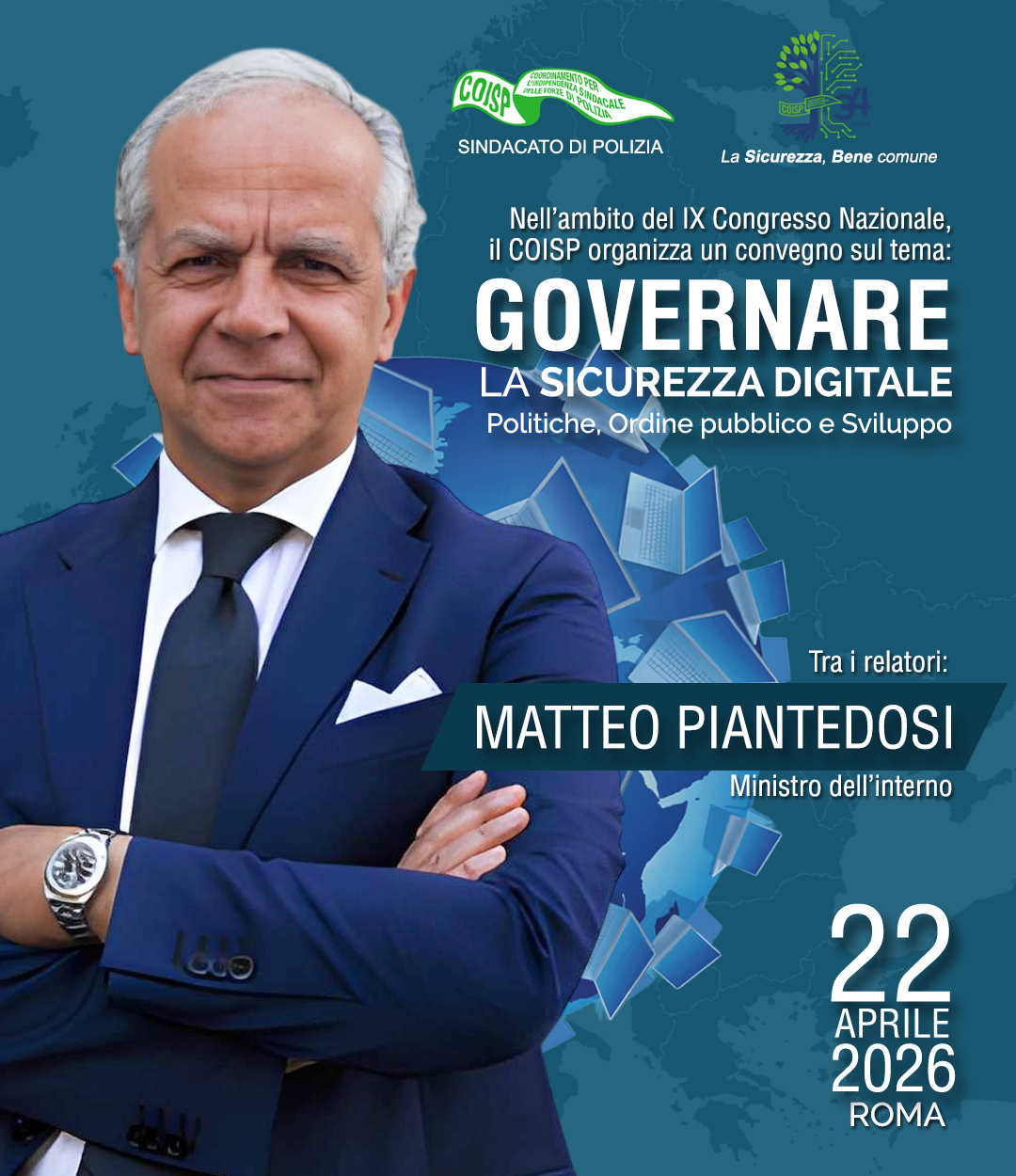Il Ministro dell’Interno Matteo Piantedosi sarà tra i relatori del convegno organizzato dal COISP sul tema: “Governare la Sicurezza Digitale – Politiche · Ordine pubblico · Sviluppo”